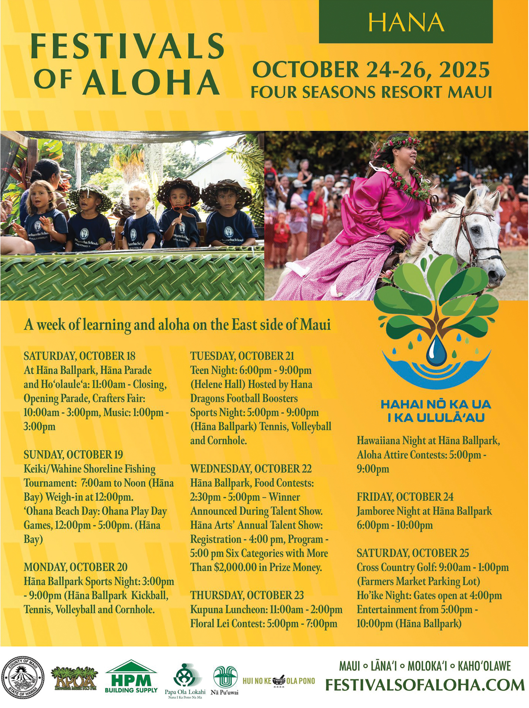 Neil’s “baby” is the Festivals of Aloha. “Festivals of Aloha was called ‘Aloha Week’ back in the ’60s. There’s a lull in tourism in October and O‘ahu businessmen wanted to create a destination event that would share Hawaiian culture with tourists.” The event spread to all the islands, but over the years was reduced to three days or a weekend. Hāna is the only community in the entire state that still has a weeklong festival.