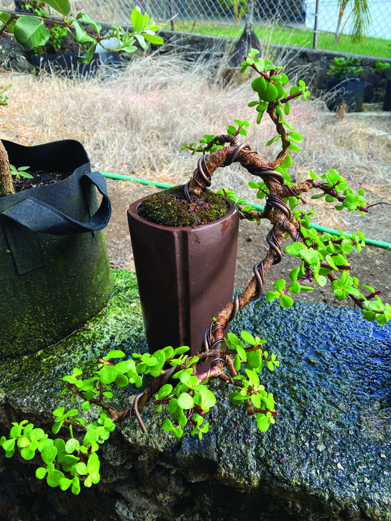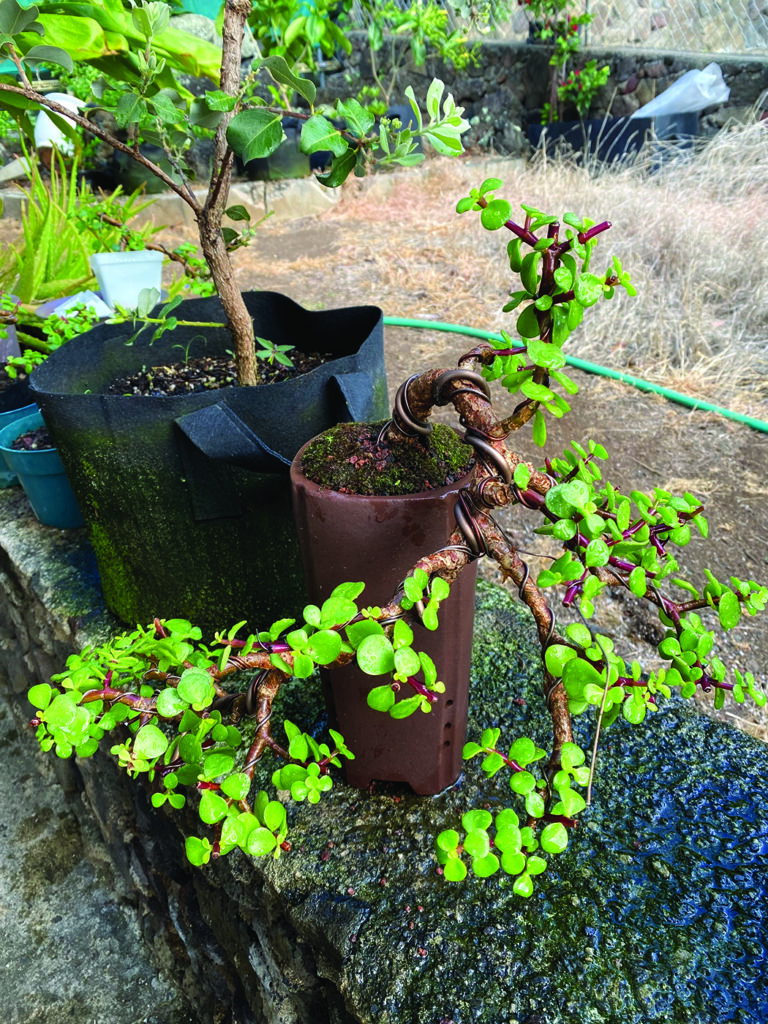 Shaping the plant as envisioned, I use copper wires. Carefully curl them around its branches like a flexible cast to bend and hold them to the desired form. There