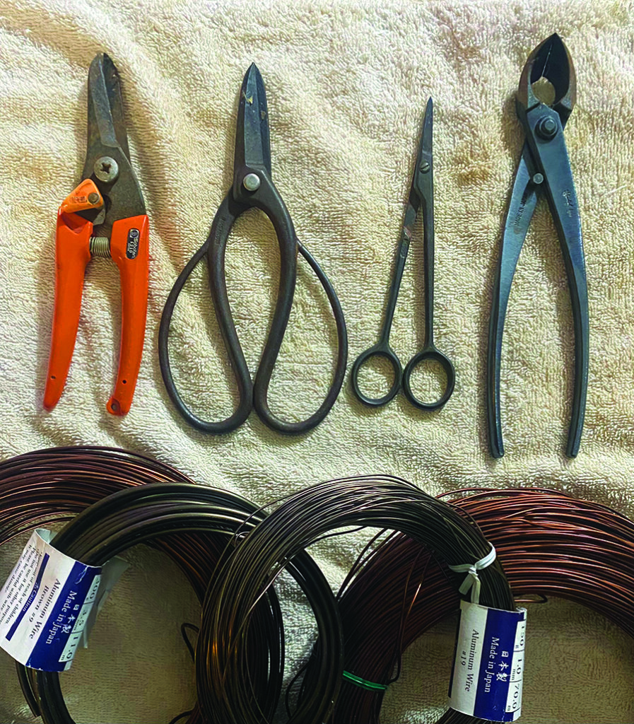The first things to consider as a beginner creating a bonsai are the basic tools: various types and sizes of shears and clippers for trimming, and an array of copper wire thicknesses.