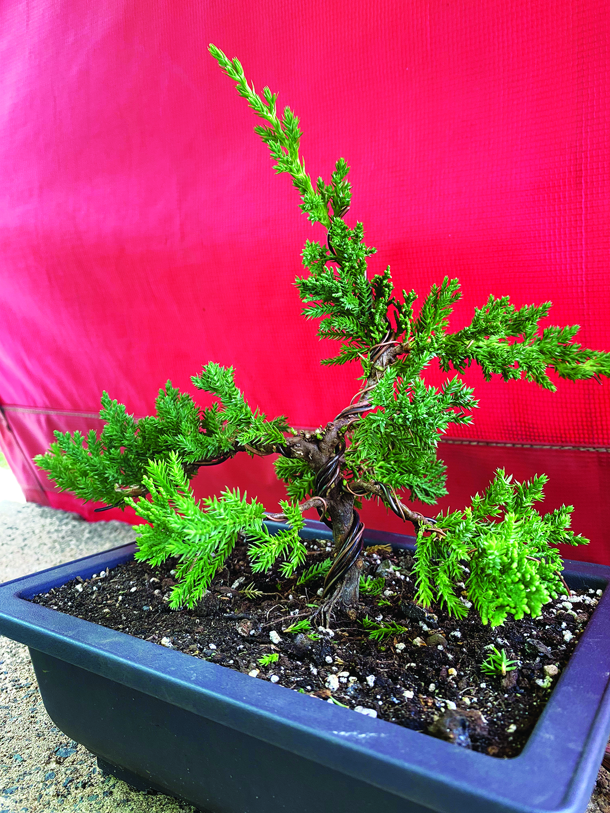are various thicknesses of wires depending on the thickness of each branch. During the next several months as the plant grows, methodically start pruning and shaping it, a little at a time, to the look you desire.