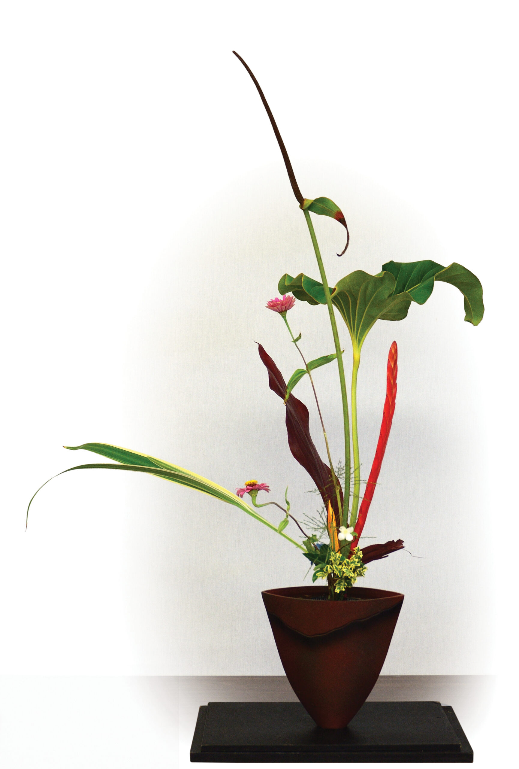 Students get the opportunity to display their arrangements at exhibitions. “An exhibition is the stage for members to celebrate their work,” according to Sen’ei Ikenobo. “By preparing the exhibition, students can be motivated to face each leaf and flower with sincerity and work on their performance.” The exhibition that will be held in the Garden Lanai Room at the Ala Moana Hotel as part of the Ikenobo Ikebana Society of Honolulu’s 45th Anniversary Celebration is called “Creating Harmony.” The webpage for the event explains: “We chose this theme as that is exactly what we’re doing when we arrange three or more diverse materials into a cohesive artistic display.” (See the “45th Anniversary Celebration” sidebar.)