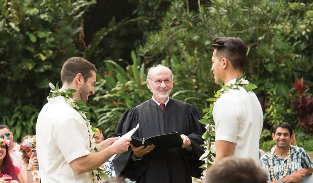 Judge Foley says, “Same-sex marriage is a right protected by the Equal Protection Clause in both the US and Hawai‘i Constitutions. I believed there should be no discrimination against persons of the same sex who apply for a marriage license. I was raised as a Catholic and attended a Jesuit university in San Francisco. I was aware of the traditional biblical view of marriage, but what controlled it was the Equal Protection Clause.”