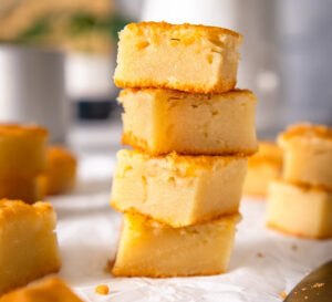 Cut the 13-inch length of the pan in fourths and then cut rows approximately an inch wide. Dust pieces with kinako or potato starch; brush off excess.